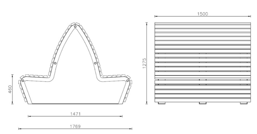 Panchina a doppia seduta con schienale, adatta per il posizionamento in piazze o in centri commerciali.