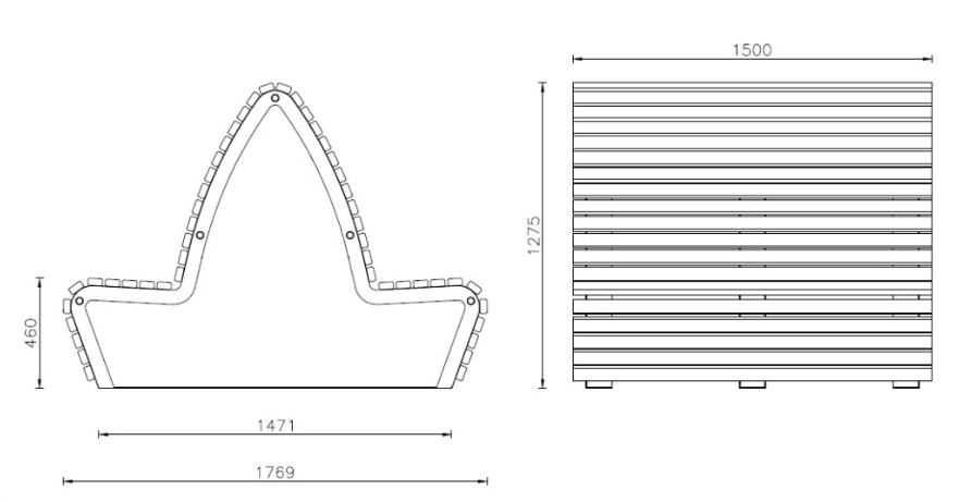 Panchina a doppia seduta con schienale, adatta per il posizionamento in piazze o in centri commerciali.