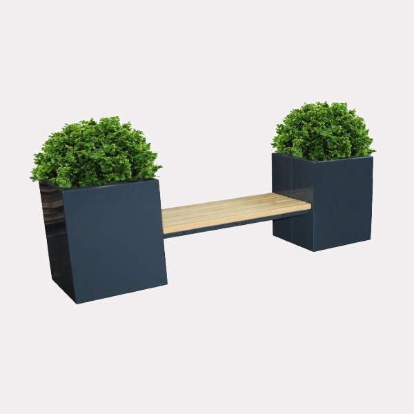 Panchina con fioriere laterali e seduta in legno, realizzata in acciaio zincato e verniciato.