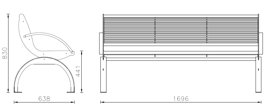 Panchina metallica costituita da due spalle laterali formate da una flangia sagomata con tecnologia laser, saldata su un arco in profilo a “T”. Il supporto è fornito di piastrine saldate alle base per poter fissare la panchina al suolo con tasselli ad espansione.