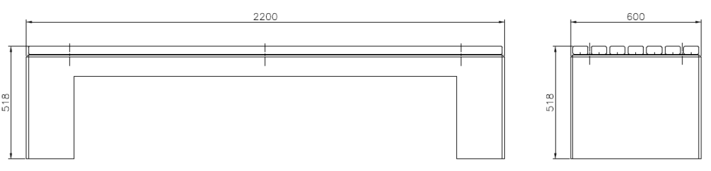 Panchina monoblocco realizzata con impasto armato con acciaio zigrinato, composto da cemento bianco 525, graniglia di marmo bianco a granulometria studiata, polvere di marmo bianco, additivi compattante e fluidificante per ridurre la percentuale d’acqua, gettato in casseforme per poi essere sabbiati ad alta pressione mediante l’utilizzo di sabbia di quarzo.