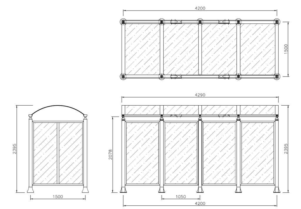 Pensilina per attesa bus Transit 4 moduli con pareti laterali può essere realizzata anche in diverse dimensioni.