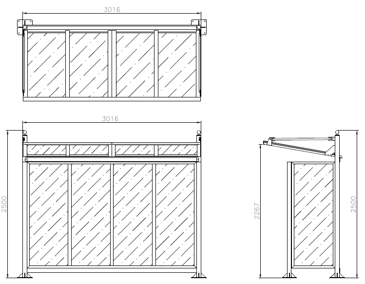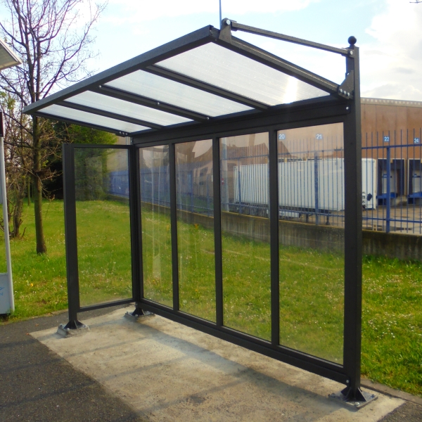 Pensilina con struttura in acciaio zincato e verniciato, copertura in policarbonato alveolare e parete di fondo e parete laterale in policarbonato compatto.