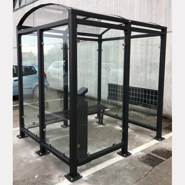 Pensilina Smoking space con parete frontale. Pensilina costituita da colonne portanti in acciaio con basi, collegate superiormente da un profilo in lamiera piegata con funzione di pluviale. La copertura è in lastre di policarbonato alveolare sostenute da una struttura composta da centine e controcentine in lamiera d’acciaio. La pensilina è fornita completa di 3 pareti laterali in vetro stratificato fissate alle colonne con adeguate pinze fermavetro, e mezza parete frontale con unico accesso. Tutte le parti metalliche sono zincate secondo normative UNI e verniciate a polveri poliestere termoindurenti. La viteria è in acciaio inox.