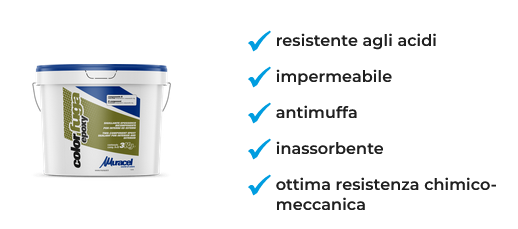 Sigillante epossidico antiacido a due componenti costituita da una parte A, composta da una miscela di inerti silicei, legante a base di resina epossidica e additivi specifici, e una parte B che funge da catalizzatore, idoneo per la stuccattura di piastrelle in ceramica e vetro-mosaici con fughe da 1 a 10mm di ampiezza.