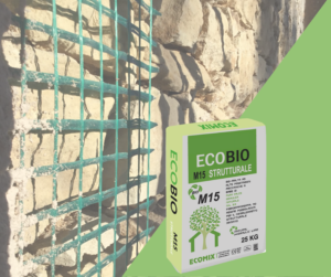 ECOBIO M15 STRUTTURALE è una malta secca a base di calce idraulica naturale NHL 3.5, leganti pozzolanici, fibre di rinforzo, inerti selezionati, con l'aggiunta di speciali additivi per migliorarne la lavorabilità, l'adesione e la resistenza.