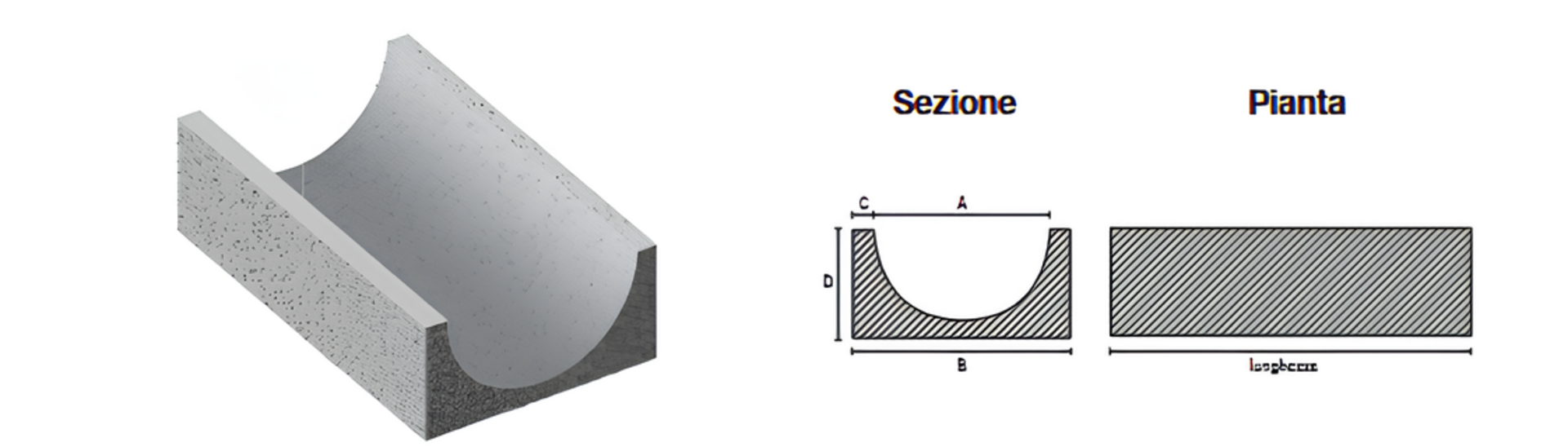 Canalette progettate per il deflusso delle acque con sezione semicircolare e base piana, ideali per applicazioni industriali e stradali.