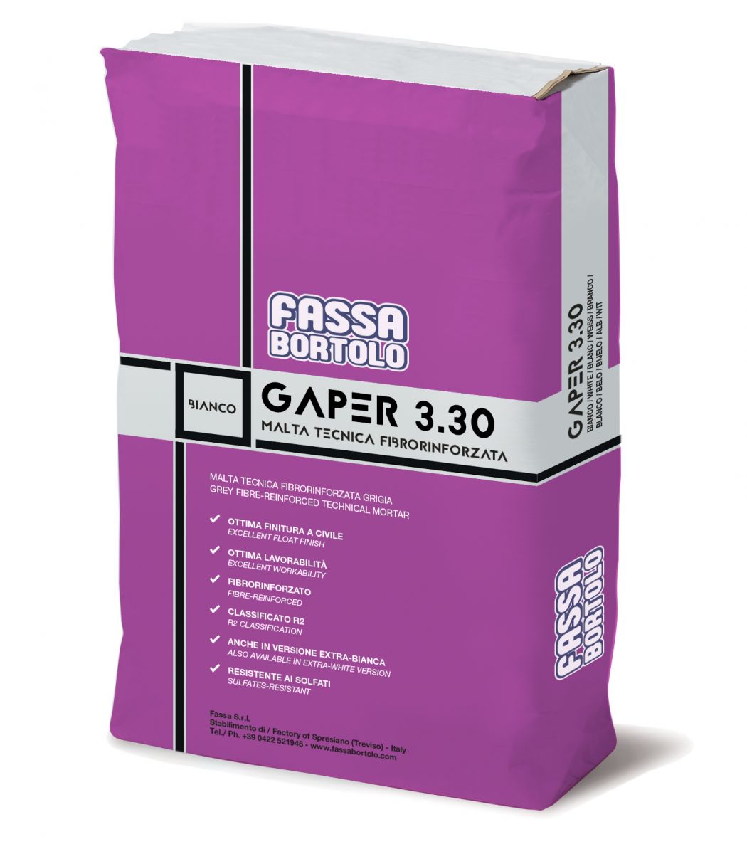 GAPER 3.30 viene usato per la regolarizzazione ed il ripristino della planarità di superfici in calcestruzzo o laterizio in interno e in esterno, in orizzontale e in verticale, con spessori da 3 a 30 mm. È idoneo anche per ripristinare gradini, per livellare o correggere le quote e linee di pendenza di massetti cementizi o piastrellature ceramiche a pavimento, previa preparazione. In breve tempo i supporti saranno adeguati per la posa di ceramica, materiale lapideo o guaine impermeabilizzanti (tipo AQUAZIP GE 97 ecc.).
