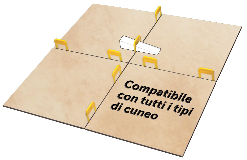 La basetta universale ZERO è compatibile con i cunei dei più diffusi sistemi livellanti presenti sul mercato. Puoi quindi riutilizzare i cunei che già possiedi senza essere costretto a comprarne di nuovi.