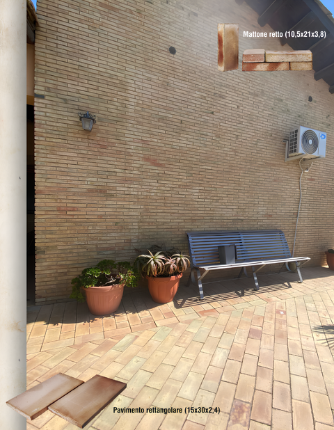 La forma rettangolare permette diverse soluzioni di posa, come schemi lineari o a spina, valorizzando terrazze, porticati, cortili e ambienti esterni. Le tonalità naturali del cotto e le leggere variazioni cromatiche rendono ogni elemento unico, contribuendo a creare superfici calde e armoniose.