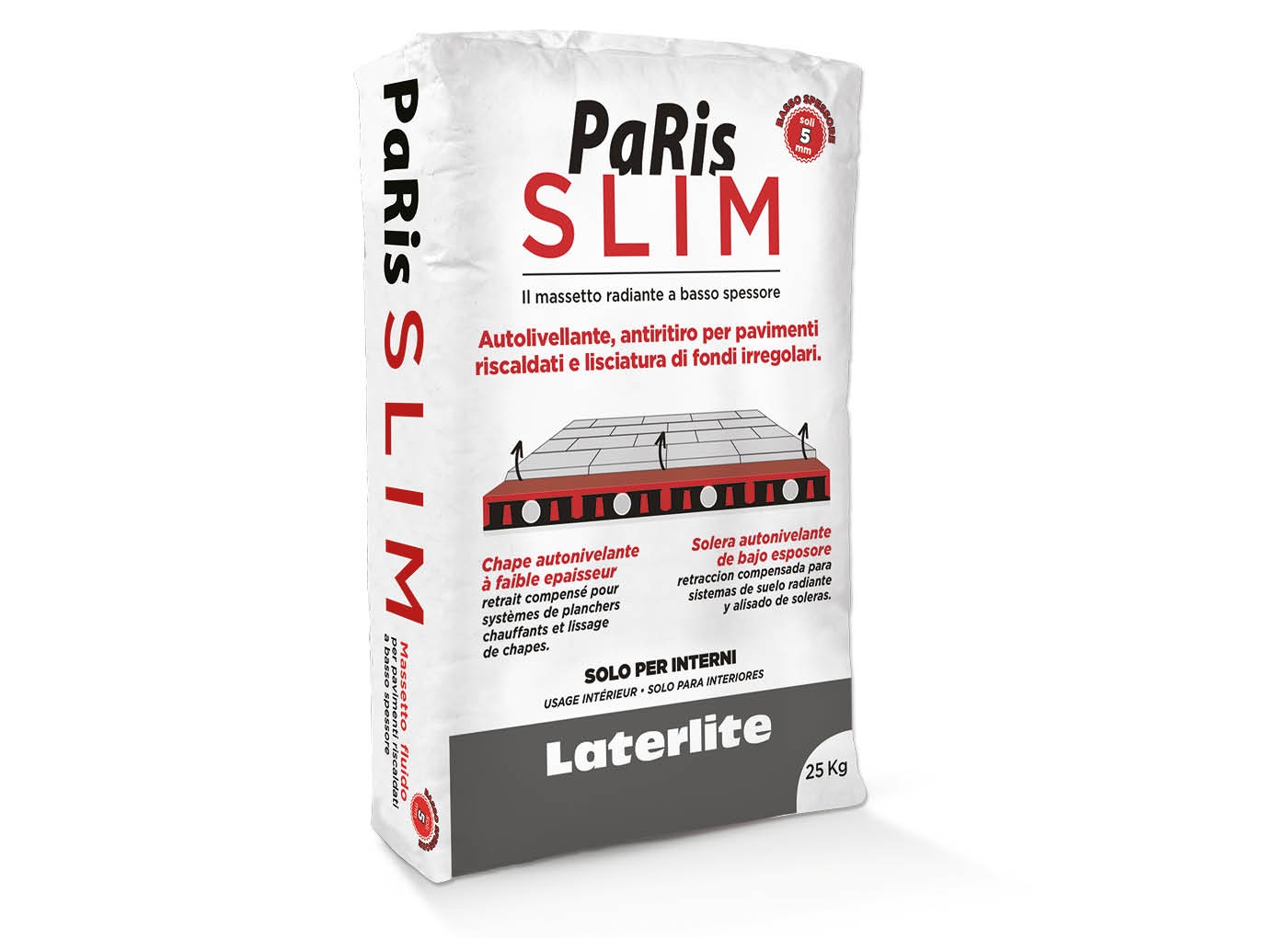 PaRis SLIM è specifico per realizzare massetti a basso spessore, sia su sistemi di riscaldamento a pavimento (da soli 5 mm sopra tubo/bugna per impianti a basso spessore e da 10 mm su pannelli tradizionali) che in adesione al supporto (da 5 mm a 50 mm). Perfetto complemento ai nuovi sistemi radianti a basso spessore specifici per la ristrutturazione, non richiede l’inserimento di alcuna rete di rinforzo né l’aggiunta di additivi fluidificanti.